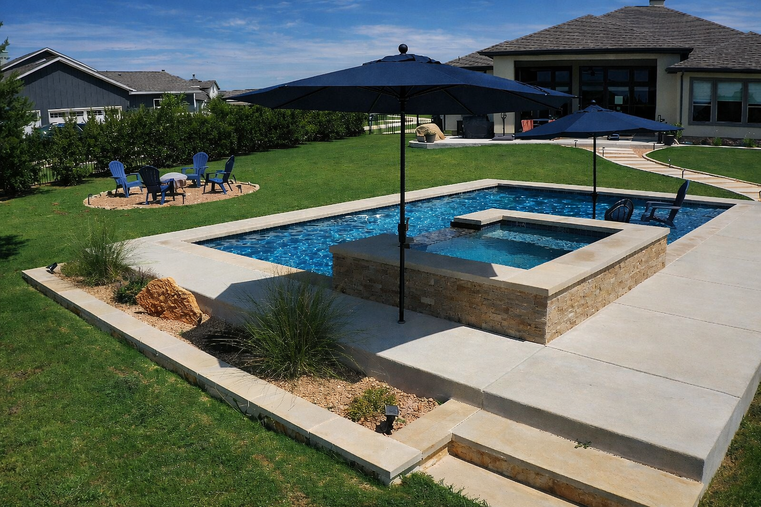 A true backyard paradise in every sense of the word. This stunning pool and spa combination showcases vibrant, tropical colors paired with timeless material selections. A spacious tanning ledge invites you to sit back, relax, and soak in the gorgeous view, while beauty and texture shine from every angle.